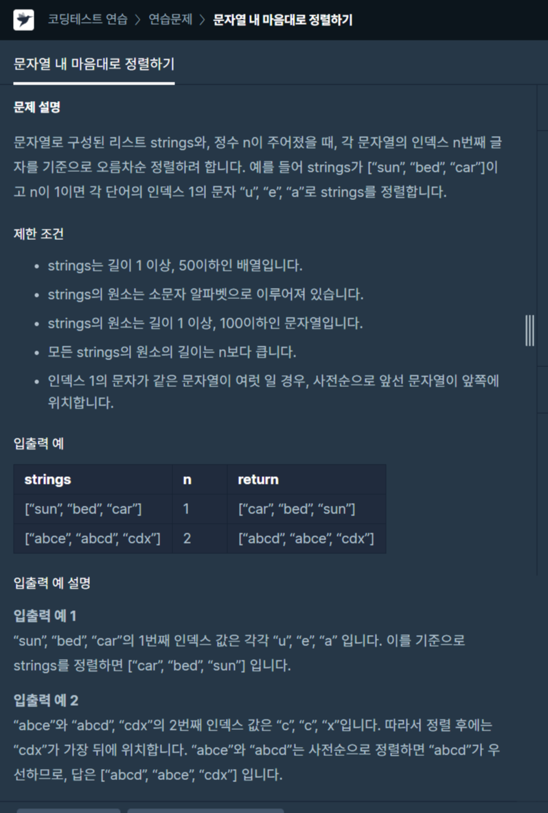 어려웠다..n번째 단어를 각 단어 앞에 붙여주고 오름차순 정렬해준 뒤 붙여놨던 n번째 단어를 substring으로 잘라내어 주었다. 검색해보니까 Comparator를 사용하던데 그러면 메소드 추가에 할게 많길래 나중에 더 공부해보는걸로...
